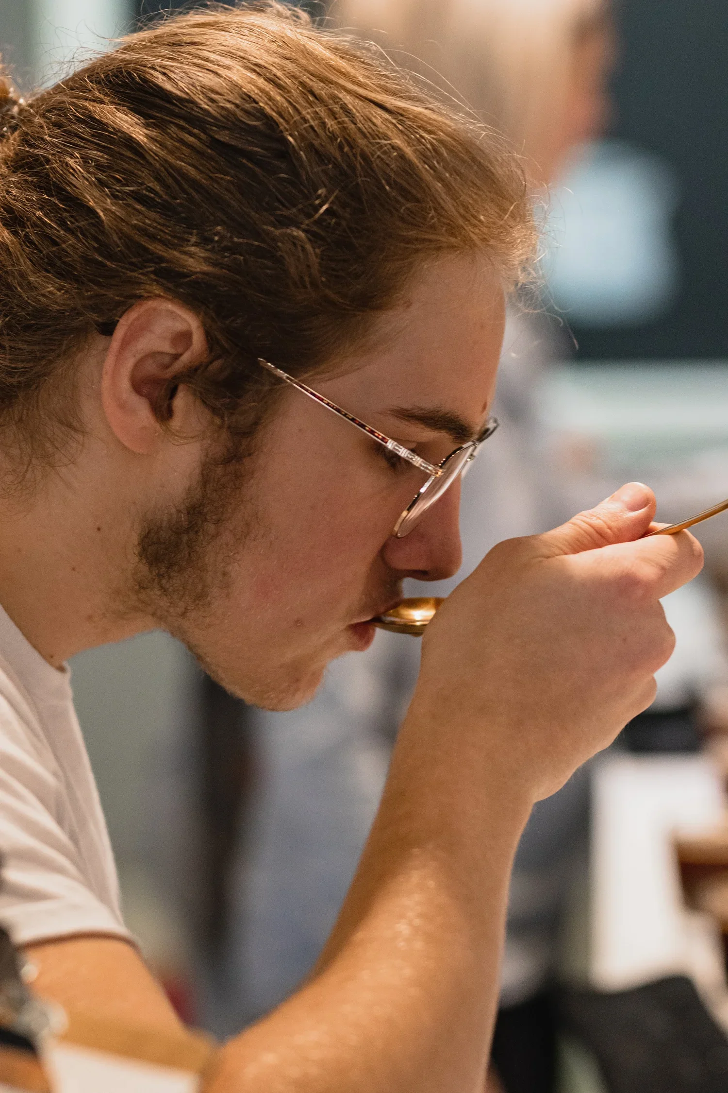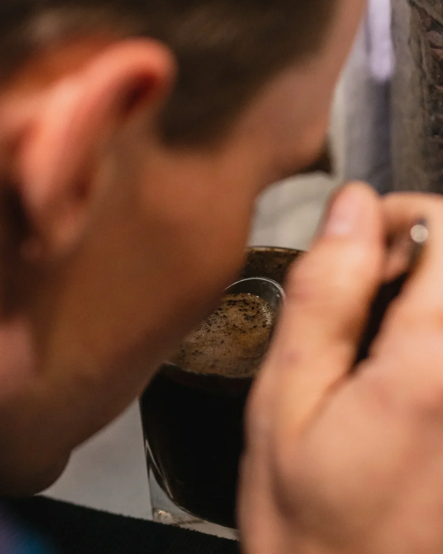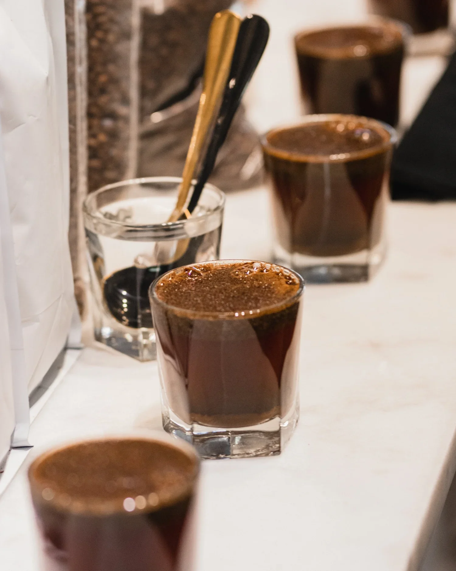 Go down the line with two cupping spoons to scrape the foam and any leftover crust off the top of each coffee. Don’t forget to rinse your spoons between coffees! Keep the spoons shallow, don’t disturb the bottom of the cup, and don’t take too much liquid off.