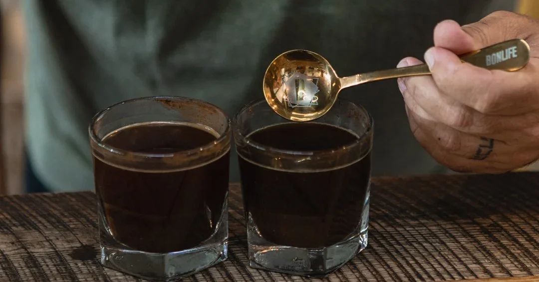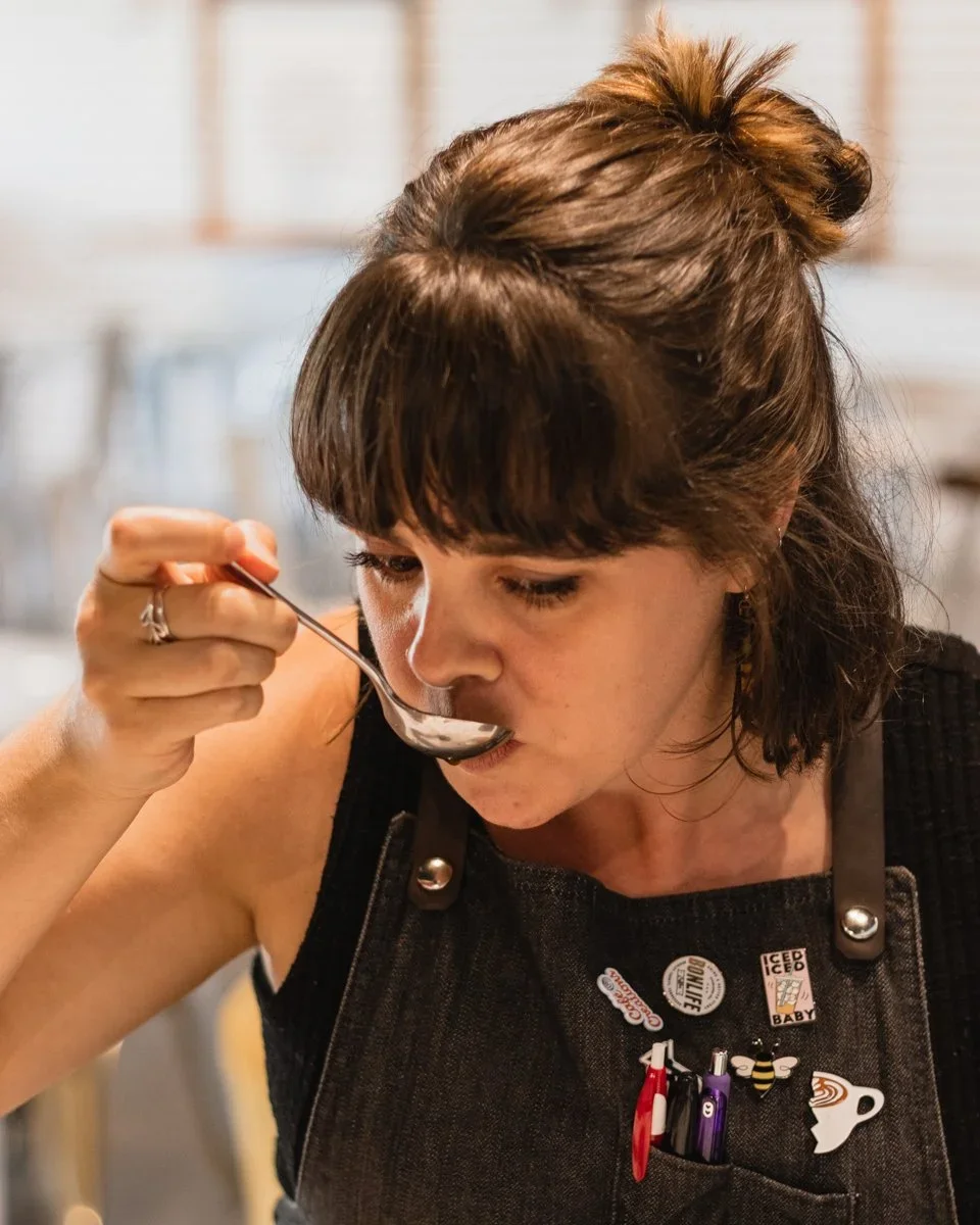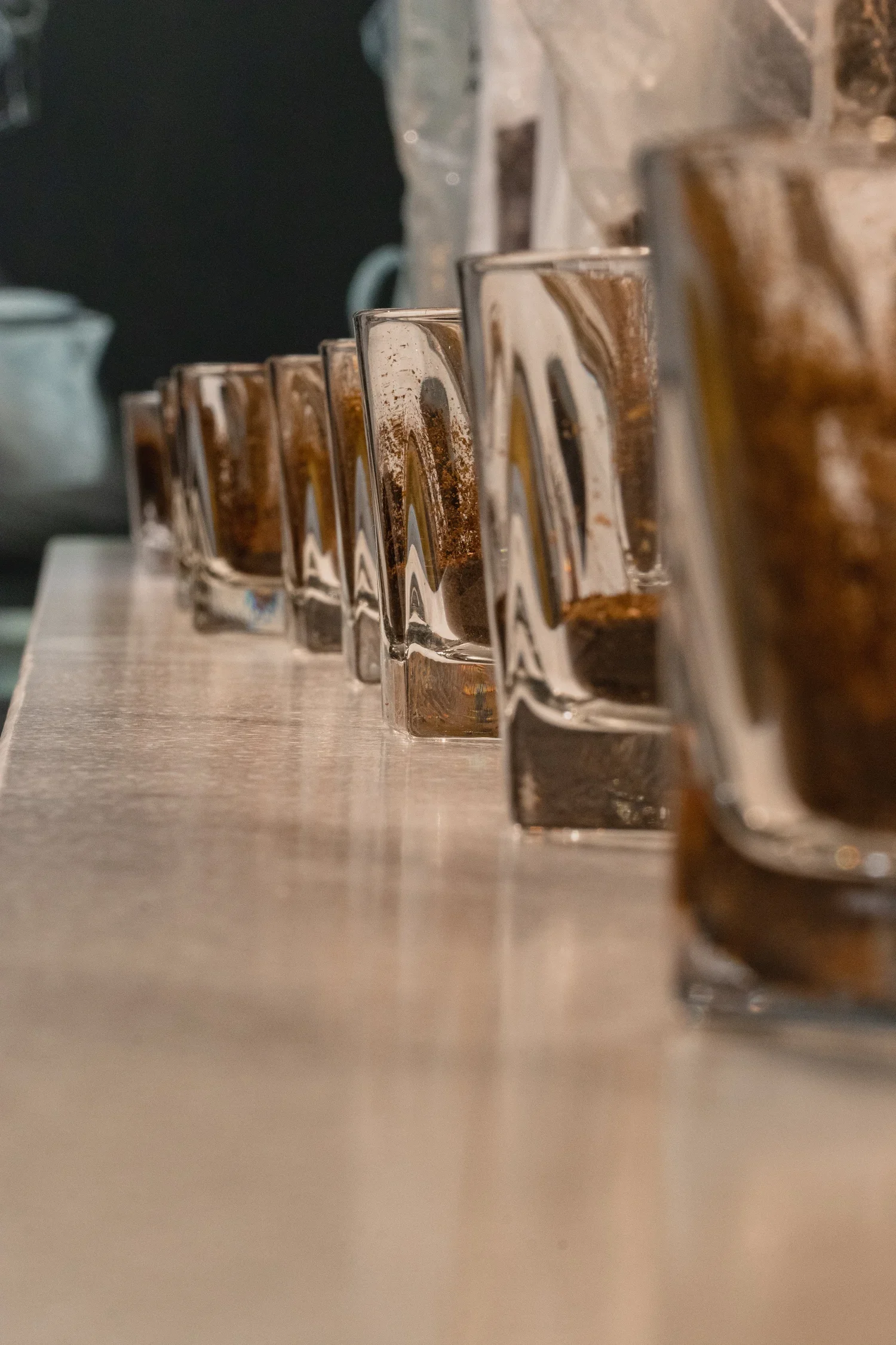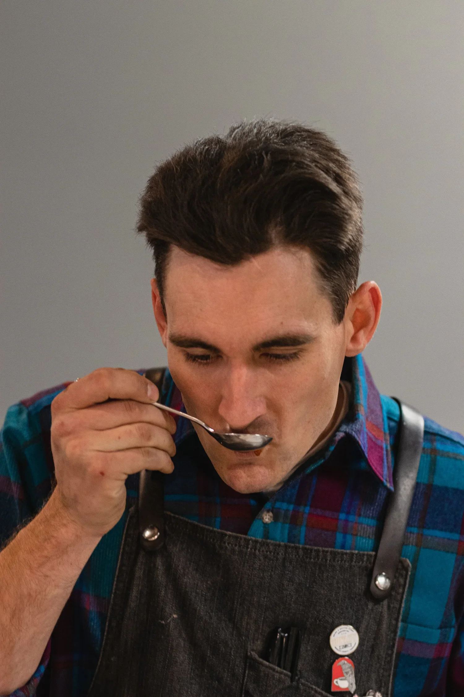 Go down the line with two cupping spoons to scrape the foam and any leftover crust off the top of each coffee. Don’t forget to rinse your spoons between coffees! Keep the spoons shallow, don’t disturb the bottom of the cup, and don’t take too much liquid off.